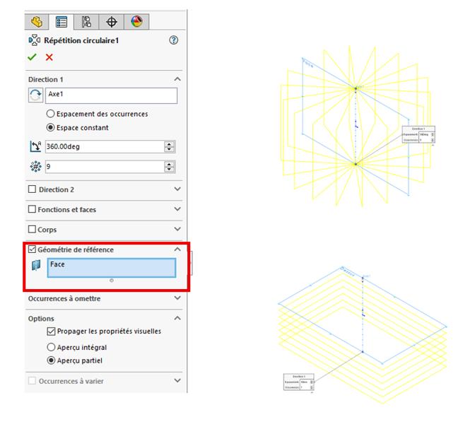 • Une répétition ne peut contenir qu'une seule entité de géométrie de référence : soit un plan, soit un axe.