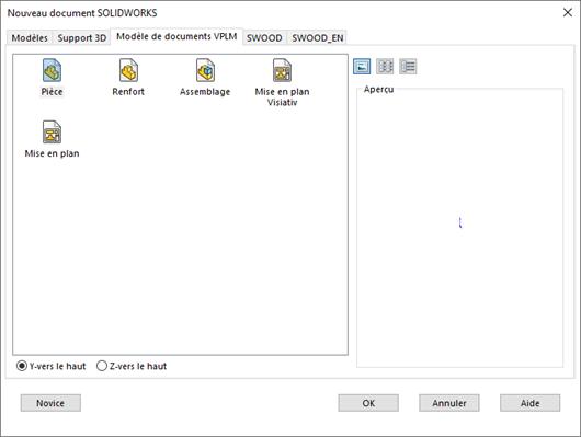 Les paramètres d'orientation Y vers le haut et Z vers le haut sont disponibles uniquement pour les modèles par défaut créés par SOLIDWORKS.