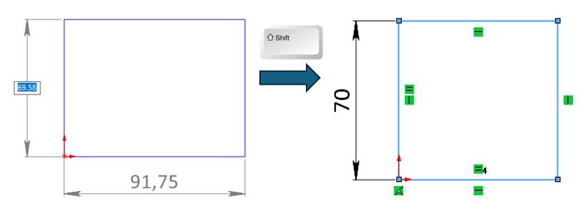 Dans une esquisse, lors de l’utilisation des outils de rectangle (rectangle par centre, par sommet, etc…) il est possible de maintenir la touche « MAJ » pour définir un carré.